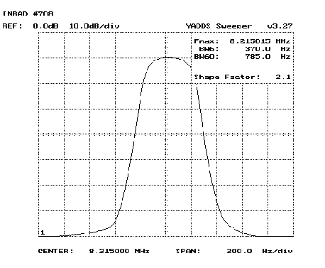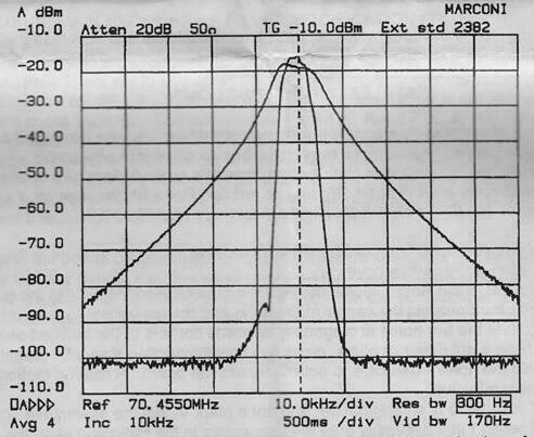 トリプルスーパーのFieldのルーフィングフィルターはオリジナルの場合-40dBにおいて50kHzほどの帯域になります。このフィルターをINRADのルーフィングフィルター(-40dBにおいて10kHzの帯域)と交換しました。すると、数値はわからないのですが、(あくまでも私の聞いた感じにすぎませんが)私は2つの印象を持ちました。1つは、40mバンドで信号の聞こえないところを聞くと(なかなかないので夜がお薦め)、以前の何となくザワザワした感じが少なくなりました。ザワザワがサワサワと聞こえるのです。2つめは、受信している信号が澄んで聞こえるのです。どちらもIMDが改善されたからなのでしょうね。INRADのルーフィングフィルターは混んでいるバンドでIMDの改善が期待できます。FT1000MP MARK-V Fieldの場合はだいたい10dBほどのようです。ノイズの量の差は、スイッチ1つでフィルターを切り替えるわけではないのでわかりません。